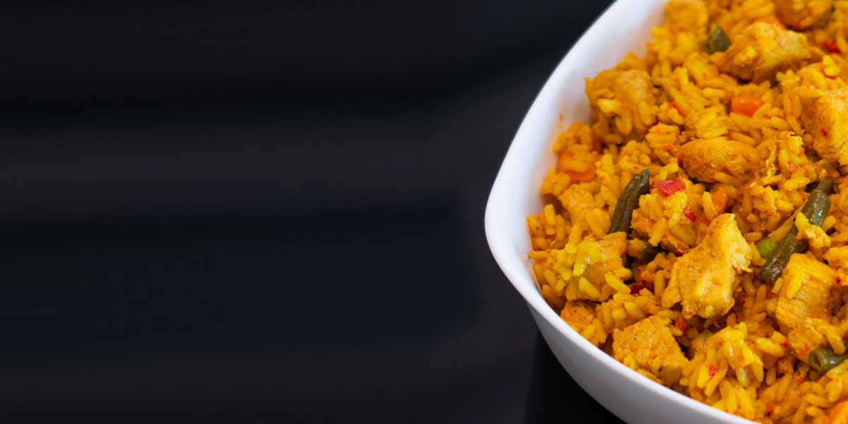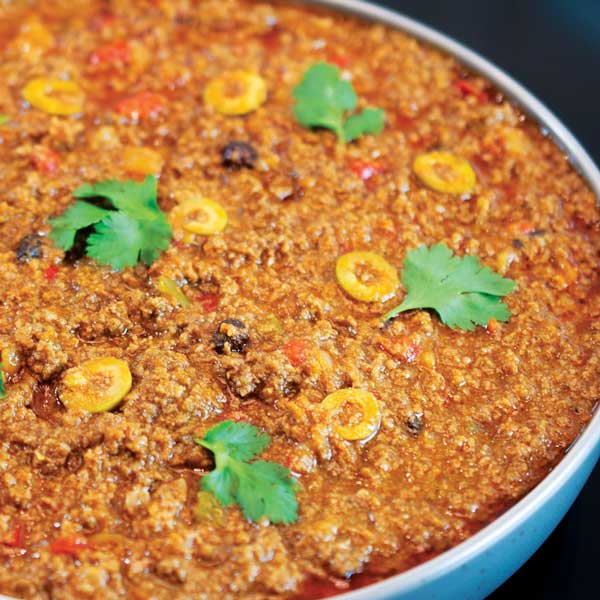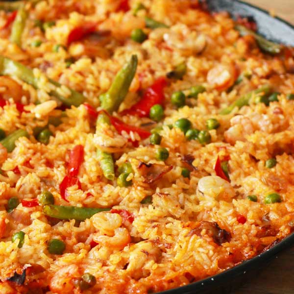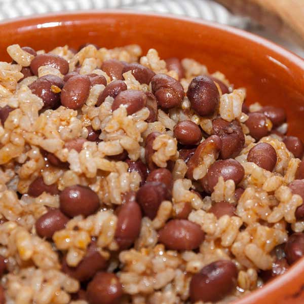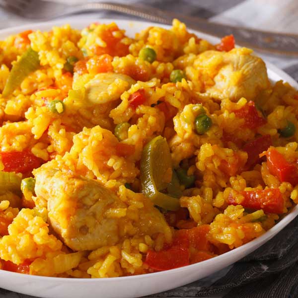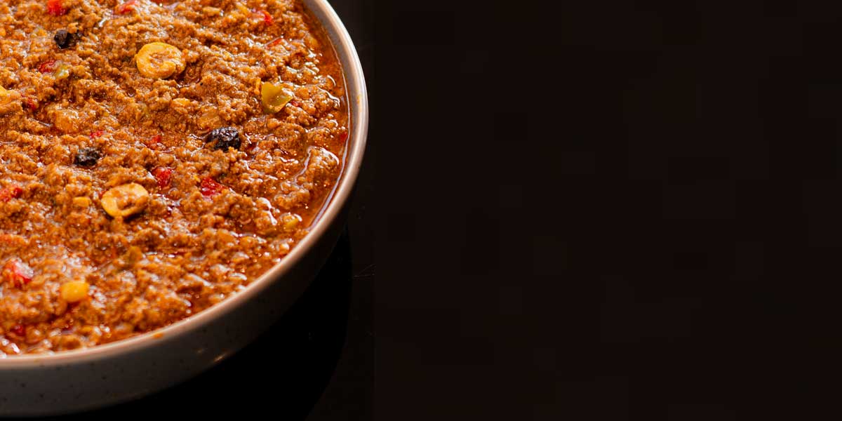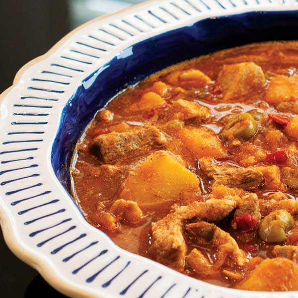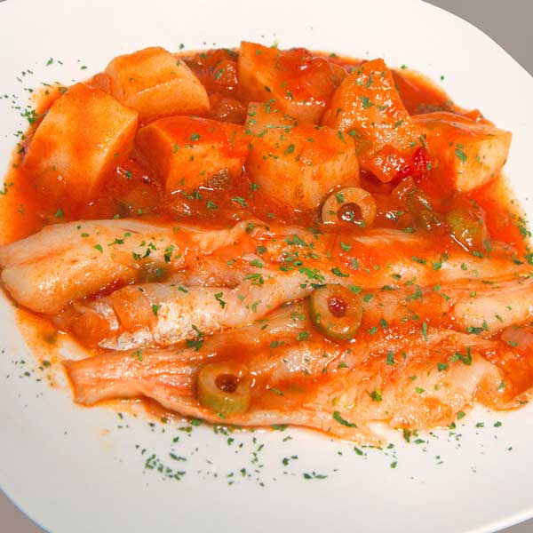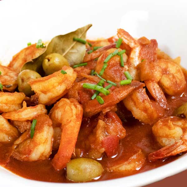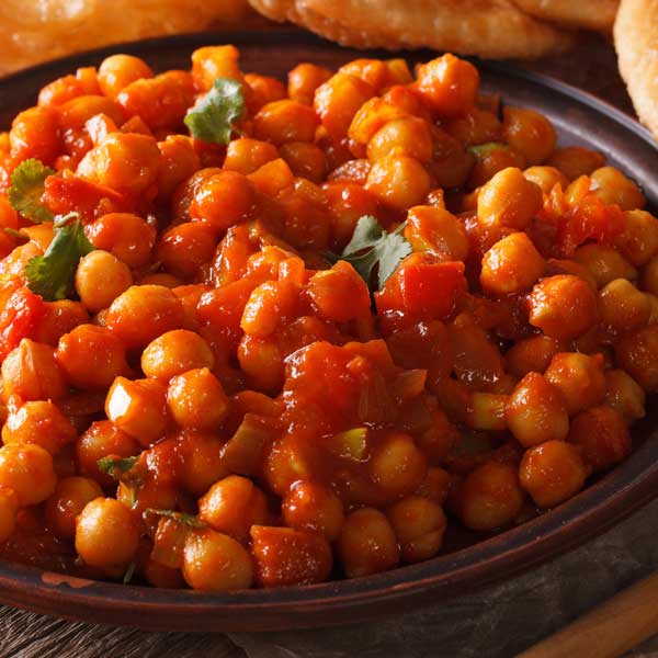 A savory dish of chickpeas and tomato flavored with ham, Spanish Chorizo, and diced veggies.